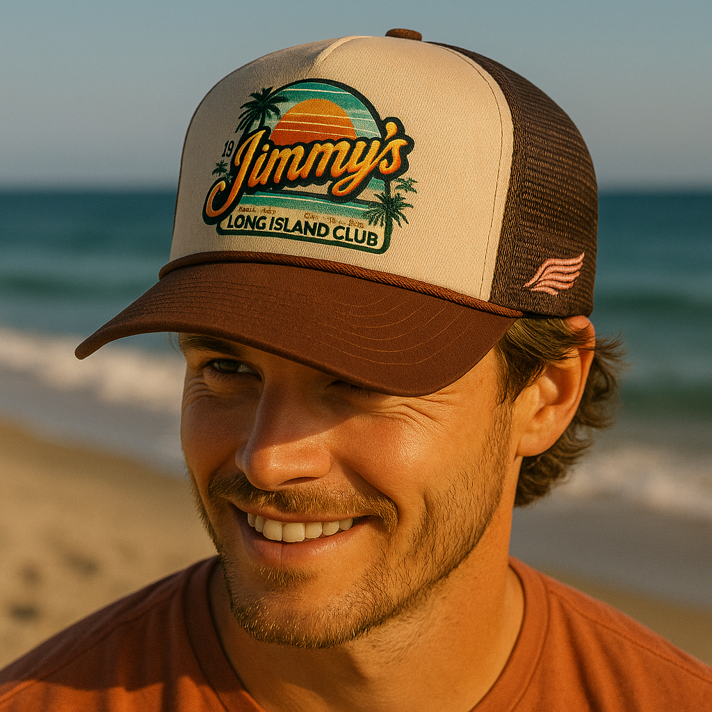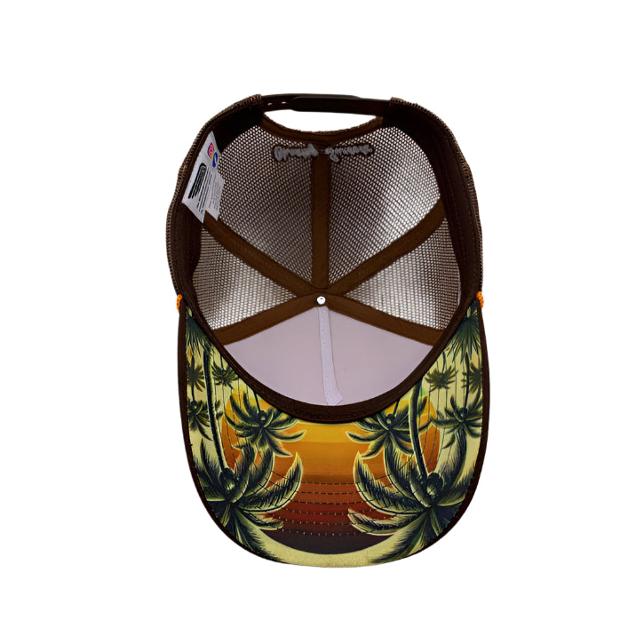 Kick back in vintage island style with the Sunset Stitch cap by Jimmy’s Long Island Club. This retro gem features a cotton front and brim in rich sunset brown, a breezy mesh back, and bold embroidered patches that bring the cool. Underbrim has a palm tree green and brown printed lining for a hidden hit of tropical flair. Sun-drenched vibes meet throwback cool. With Chasing Sunsets embroidered across the back - this one’s for the laid-back legends.